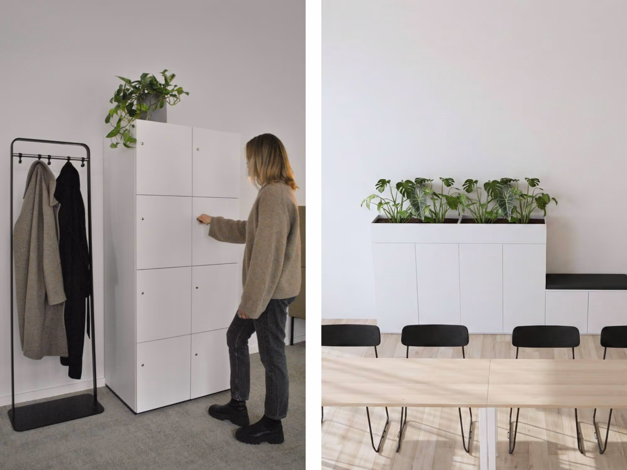Storage options may include modular cabinets, lockers with key-lock integrated solutions, sliding-door units, and storage elements that double as room dividers or plant-integrated solutions.