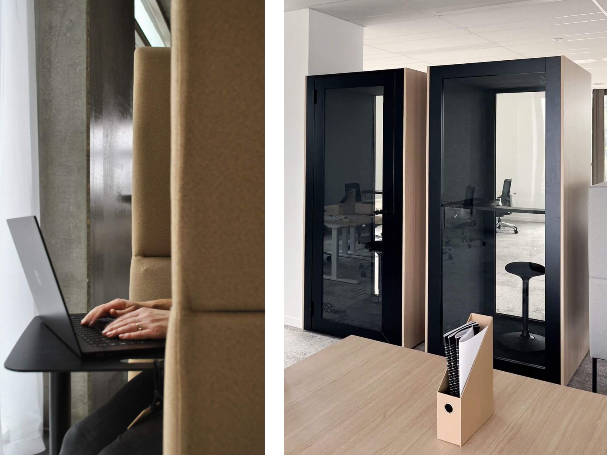 Phone booths and room-in-room solutions can be added to your setup and are planned into the overall office layout. View our range of office booths here.