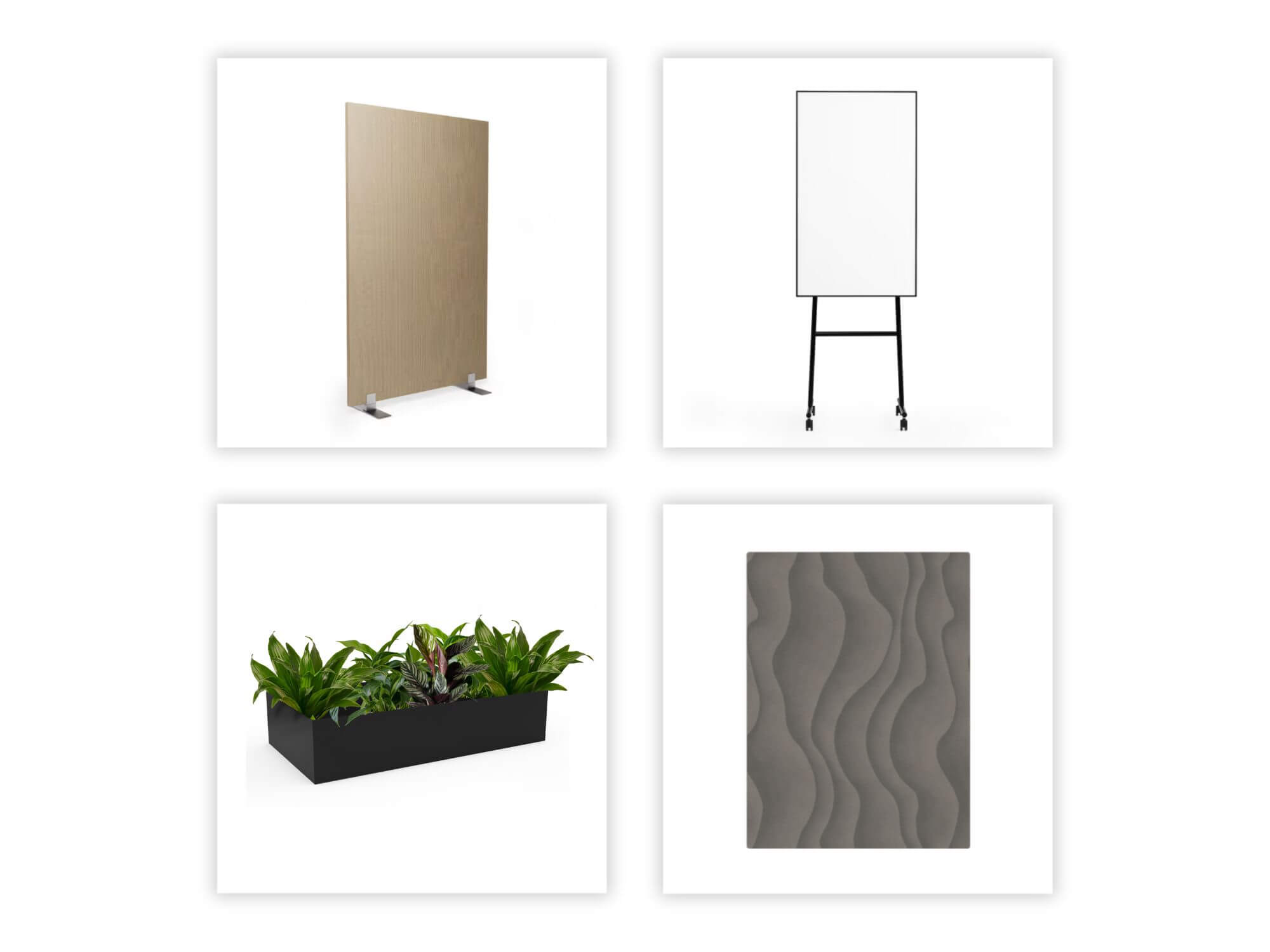 Extras include versatile privacy screens (table mounted, floor, and room dividers) and whiteboards. Complementing accessories like Rugs and integrated plant boxes for the essential finishing touches, alongside Room-in-room solutions for specialised areas and flexible space utilisation.
