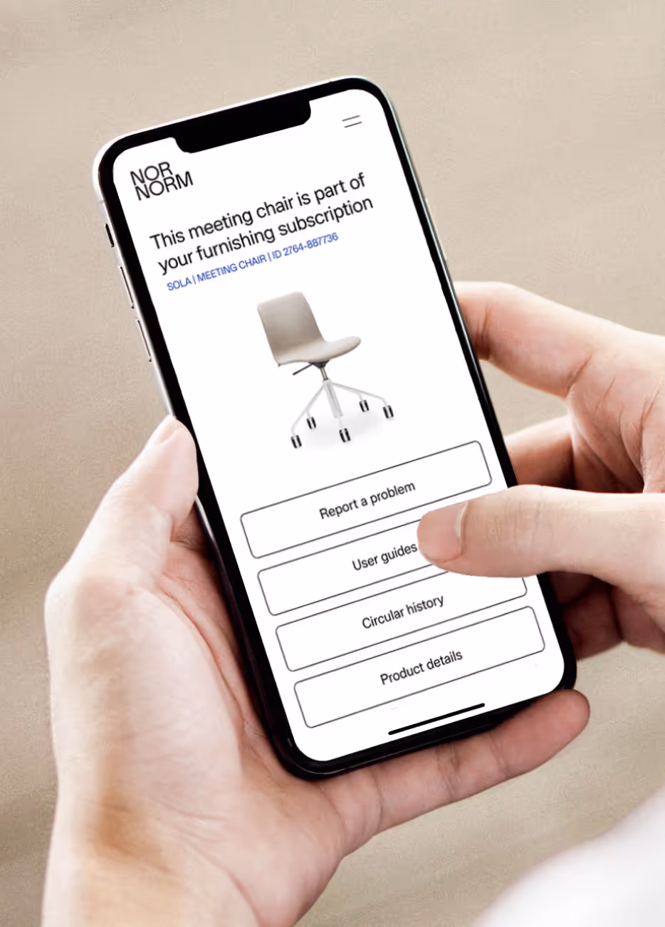 Day-to-day help, built in. Use the NORNORM platform to report issues, request support, and manage your furniture, all without having to coordinate multiple suppliers.