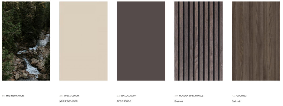 - Wanden: warme grijzen en gedempte kleuren (zoals NCS S 6502-G, of de kleuren hieronder)