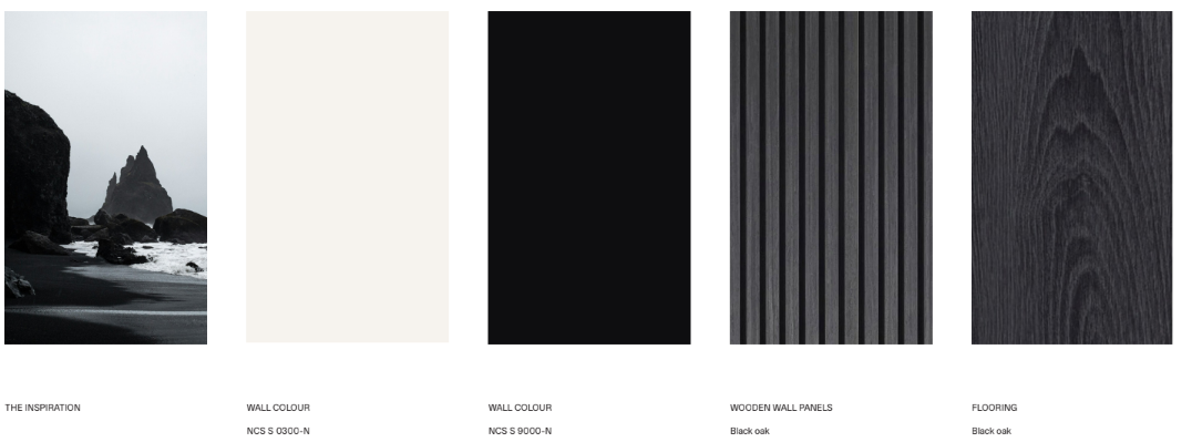- Wanden: wit of diep zwart (NCS S 0300 N / S 9000 N)